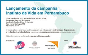 A iniciativa será lançada em Recife no próximo dia 30 de outubro (segunda-feira), às 10h30, na Faculdade Maurício de Nassau, com a presença de autoridades, especialistas e representantes da sociedade civil, em evento organizado pelo Instituto Igarapé, baseado no Rio de Janeiro, e pela Visão Mundial, que tem escritório em Recife. Na ocasião, será realizado um diálogo sobre estratégias relacionadas à redução de homicídios, com participação de Ilona Szabó, diretora executiva do Instituto Igarapé, e Aline Kerber, diretora executiva do Instituto Fidedigna (Rio Grande do Sul). O objetivo é estimular a adesão de autoridades e cidadãos em relação aos valores e metas da campanha.