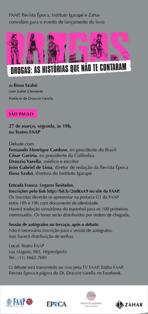 O lançamento será precedido por um debate sobre as políticas de drogas no Brasil e no mundo com a participação do ex-presidente Fernando Henrique Cardoso; do ex-presidente da Colômbia César Gaviria; do médico e escritor Drauzio Varella, autor do prefácio do livro; e da autora, Ilona Szabó. O debate será mediado pelo diretor de redação da revista Época, João Gabriel de Lima.