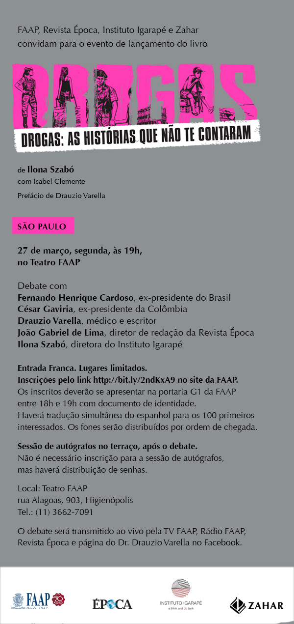 O debate é uma realização da editora Zahar, FAAP, Revista Época e Instituto Igarapé. Para participar, é necessário fazer a inscrição pelo link: http://bit.ly/DROGASdebate. Os ingressos deverão ser retirados entre 18h e 19h na bilheteria do teatro, mediante apresentação de documento com foto (RG).