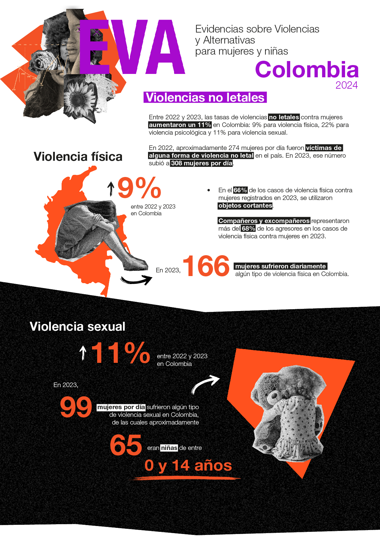 Datos de la plataforma EVA (Evidencias sobre Violencias y Alternativas para Mujeres y Niñas), desarrollada por el Instituto Igarapé en colaboración con Uber, señalan que, entre 2022 y 2023, las tasas de mujeres víctimas de violencia no letal en Colombia aumentaron un 11%, pasando de 274 a 308 casos por día, resaltando la necesidad de políticas públicas más eficaces y preventivas.