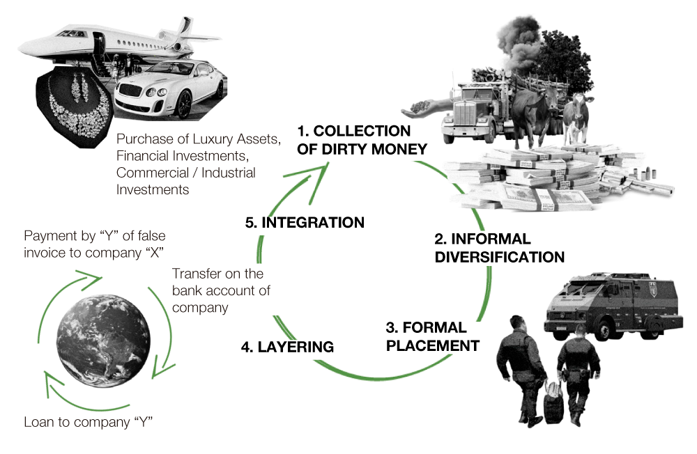 The Igarapé study shows that the money laundering cycle follows three stages before the laundered funds can enter the financial system: placement, layering, and integration. However, not all proceeds from criminal activity are directly laundered into the formal financial system. Thus, informal diversification constitutes the process of moving illegal flows into the informal economy. It is estimated that 30% of the money to be laundered is used to pay the operating expenses of illicit economies. Cash transactions, divided into small amounts and deposited by “money mules,” are used to finance the hiring of precarious labor, accommodations, food, security, transportation, health services, leisure, and machinery, for example. The remaining 70% of illicit proceeds are formally inserted into the financial system.