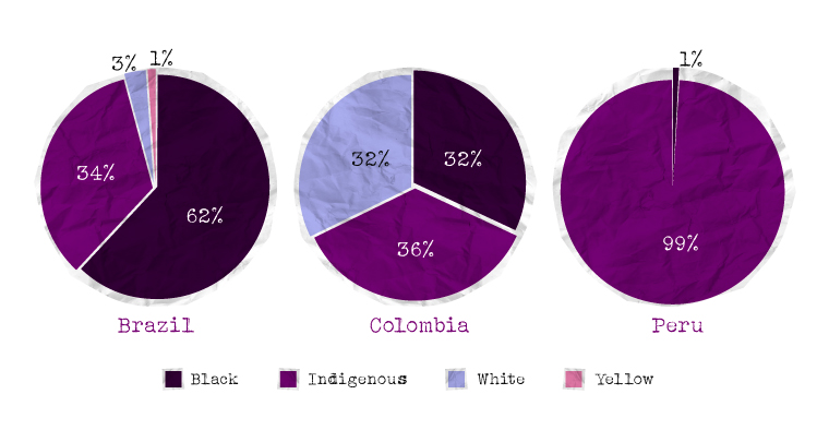 The defenders interviewed reflect the diversity of the various Amazon regions. In Brazil, the majority are black. Colombia balances the three ethnic-racial identities, and in Peru, almost all are indigenous.