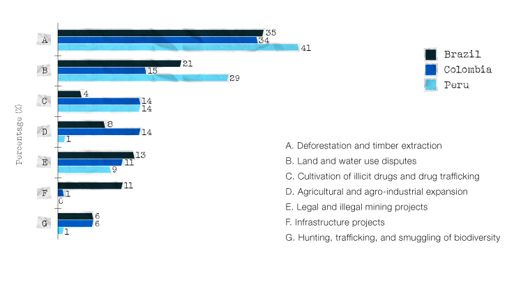 The interviewed women pointed out that the conflicts in their territories are driven by deforestation, infrastructure projects, and the presence of illegal mining in Brazil; deforestation, drug trafficking, and agro-industry in Colombia; and territorial disputes, illegal timber extraction, and deforestation in Peru.