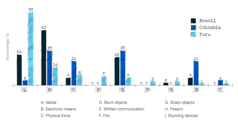 The means used to commit violence against defenders vary according to each country. In Brazil, electronic means, including social media, have become the primary instrument of the perpetrators, while in Peru, verbal violence still prevails. In Colombia, the most used medium is digital and written communication, although the use of firearms and physical violence also stands out.