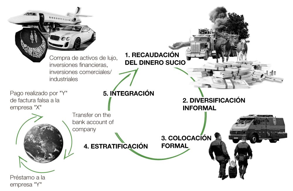 Se estima que el 30% del dinero a lavar se utiliza para pagar los gastos operativos de los ahorros ilícitos. Las transacciones con efectivo, fraccionadas en pequeñas cantidades y depositadas por “mulas monetarias”, se utilizan para financiar la contratación de mano de obra precaria, alojamiento, alimentación, seguridad, transporte, servicios de salud, ocio y maquinaria, por ejemplo. El 70% restante de los recursos ilícitos ingresan formalmente al sistema financiero.