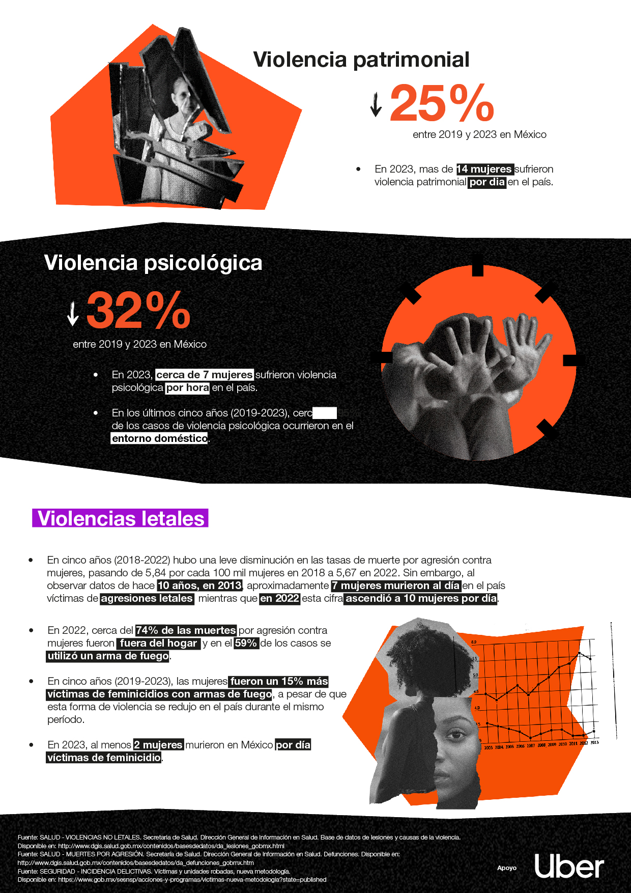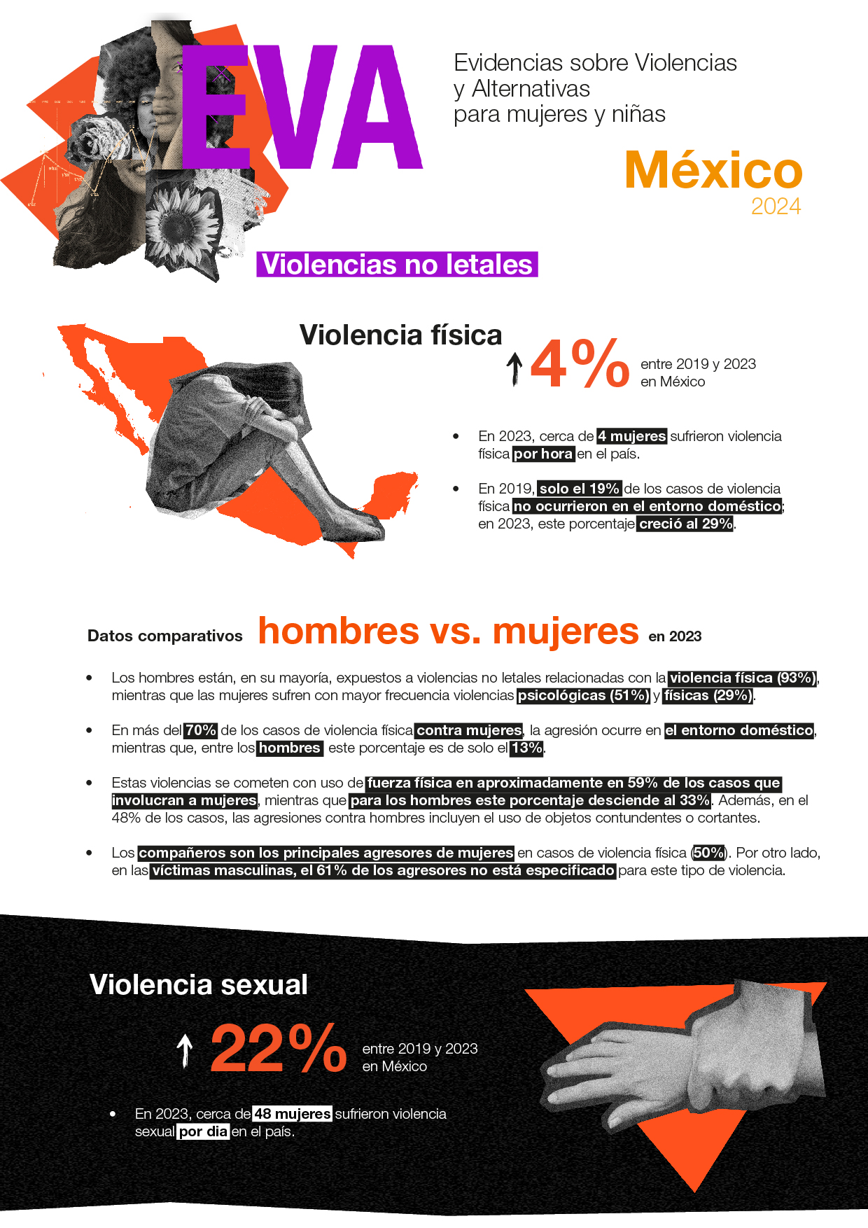 Datos de la plataforma EVA (Evidencias sobre Violencias y Alternativas para Mujeres y Niñas), desarrollada por el Instituto Igarapé en colaboración con Uber, señalan que, entre 2019 y 2023, las tasas de violencia sexual en México aumentaron un 22%, mientras que las de violencia física crecieron un 4%. En 2023, cada día, más de dos mujeres fueron víctimas de feminicidio, una cifra equivalente a más de ocho aviones llenos en un año.
