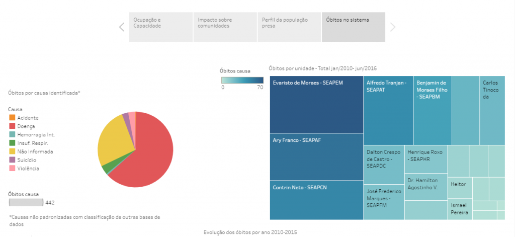Morreram no sistema penitenciário fluminense 442 pessoas de 2010 a 2016, das quais as mortes por doença representam montante significativo. Porém, a classificação das causas é deficiente e não segue padrão adotado por outros órgãos de registro de óbitos.  A deficiência na classificação impede que se calcule uma taxa de mortes violentas exata.