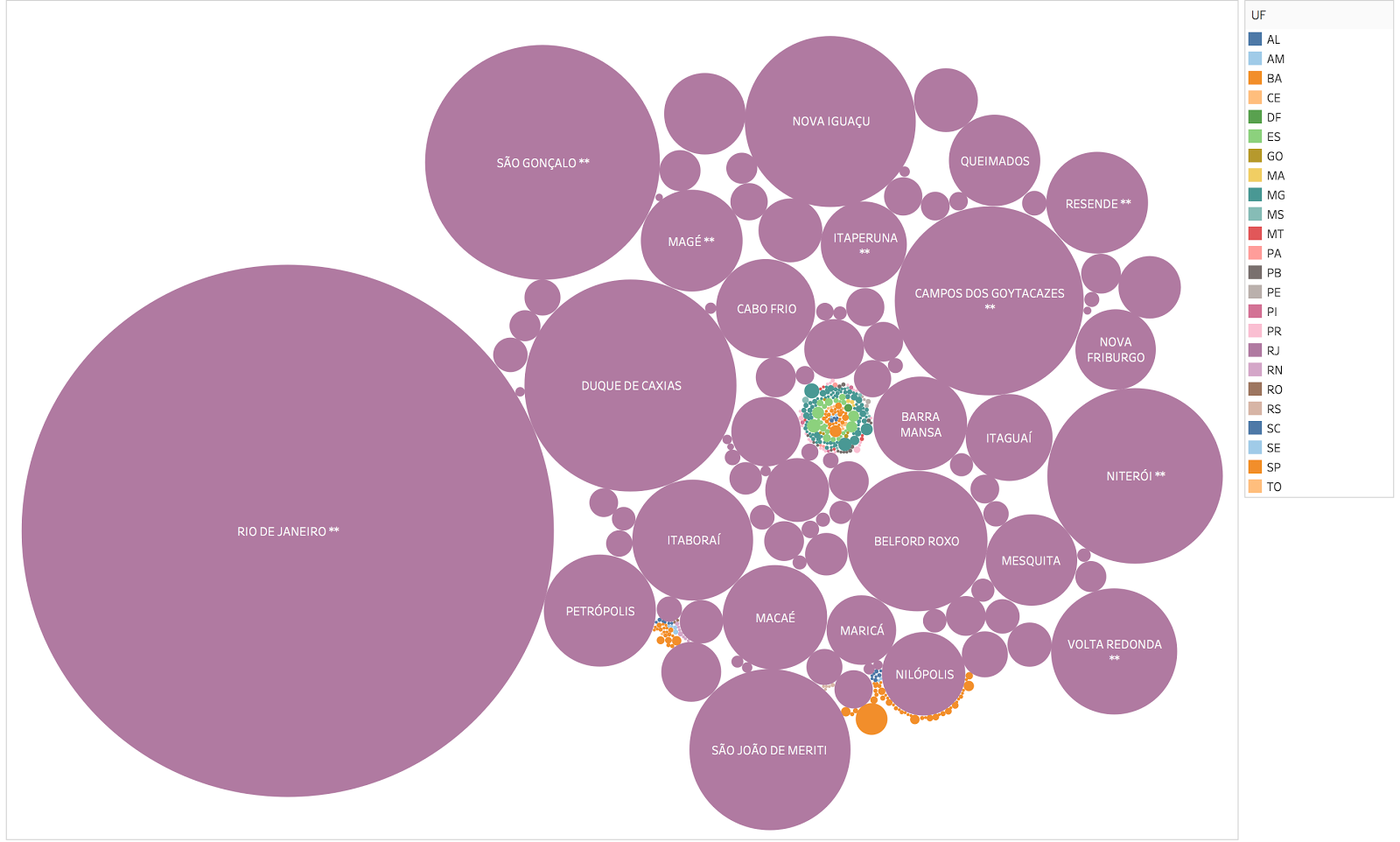 Apesar de os complexos penitenciários do sistema fluminense estarem concentrados em apenas 10 cidades, há visitantes cadastrados nos 93 municípios do estado, além de uma minoria registrada em municípios em outros estados. “No Rio, há uma concentração de grandes unidades na capital e redondezas, com poucos complexos no interior. Em outros estados, o sistema é mais pulverizado e com presídios menores. Essa geografia não reflete o perfil da população impactada pelo sistema”, explica Ana Paula Pellegrino, pesquisadora do Instituto Igarapé.